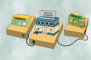 Deze stukjes tekst staan voor een licentie, waarmee de bijbehorende inhoud wordt opgenomen in de Creative Commons. Zie dit als een soort tastbaar collectief geheugen. Een fotograaf kan afbeeldingen van een gebouw onder een Commons-licentie op het internet zetten, en vervolgens kan iedereen daarmee aan de haal om iets nieuws te maken, wat al bestaat aan te vullen of hiervan te leren. De implicaties van de licenties verschillen op basis van wat de originele maker instelt. Zo vereist de eerder genoemde CC-BY-SA-licentie dat er credit wordt gegeven aan de persoon achter het originele werk – dat is het ‘BY’-gedeelte – en moet het nieuwe werk weer onder dezelfde licentie terechtkomen.